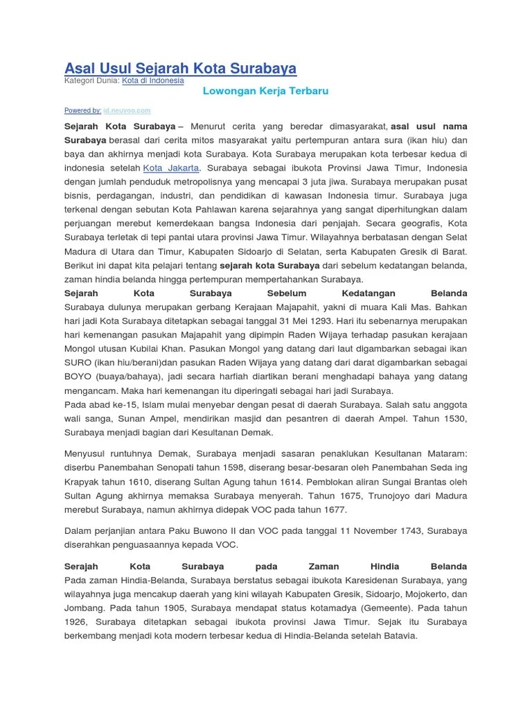Kedua hewan tersebut adalah seekor ikan hiu dan seekor buaya. Pada umumnya masyarakat kota surabaya menyebutnya, bahwa asal usul kota surabaya adalah dari kata … Prabu brawijaya banjur ngutus sungging prabengkara nggoleki garwane sang prabu. Mereka sering berselisih dan berkelahi ketika memperebutkan makanan. 20.02.2016 · asal usul kota surabaya :